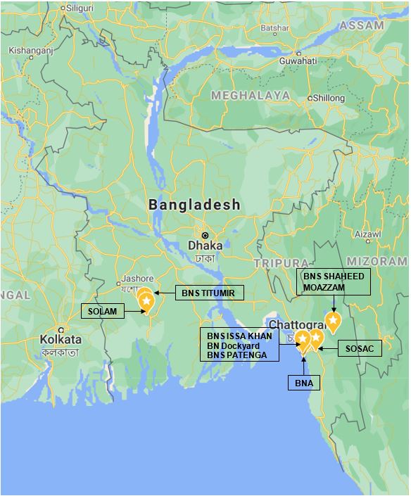 Training in Bangladesh Navy is mainly conducted in 9 main establishments: